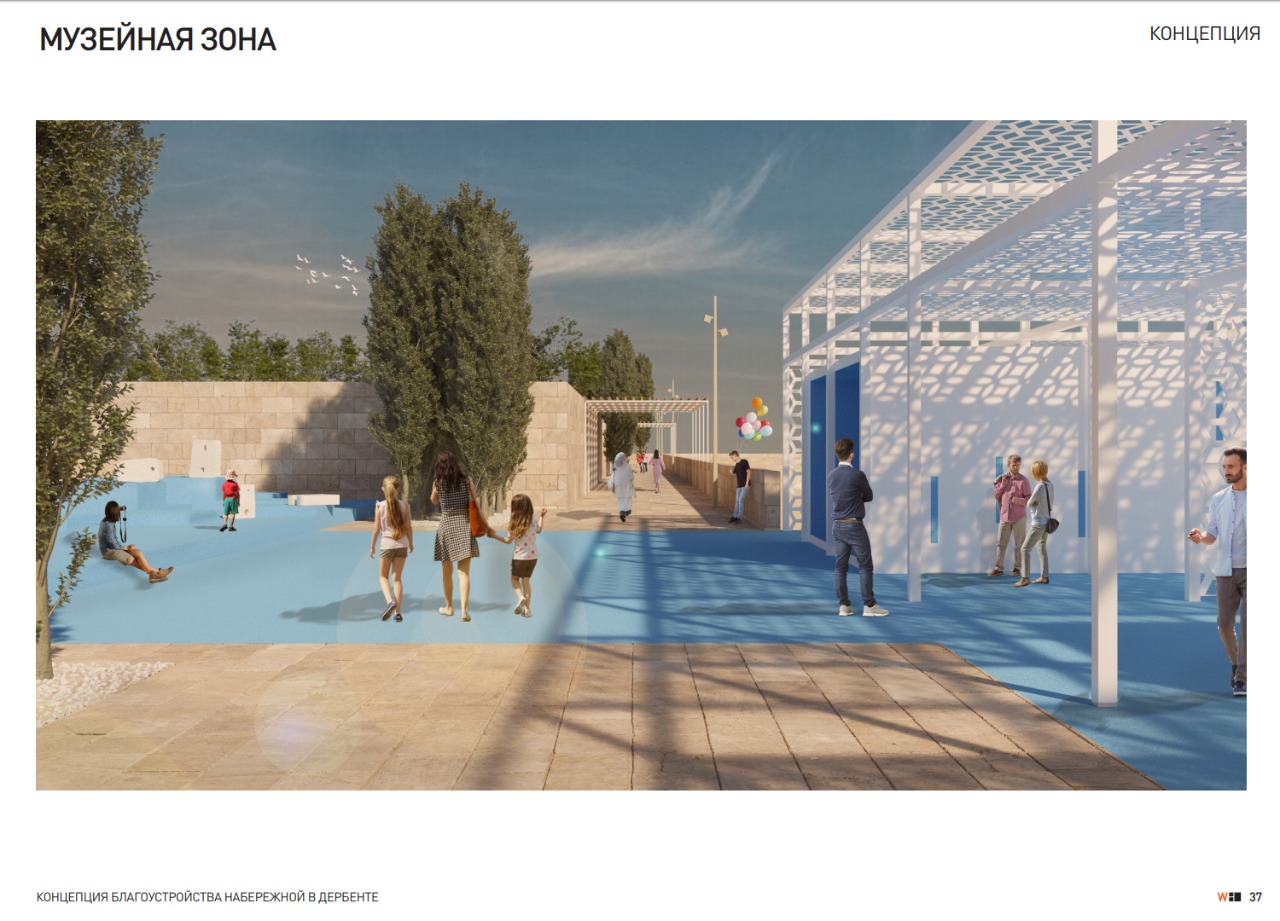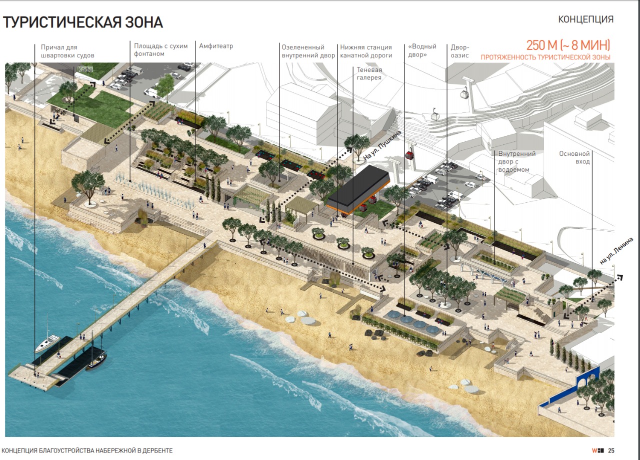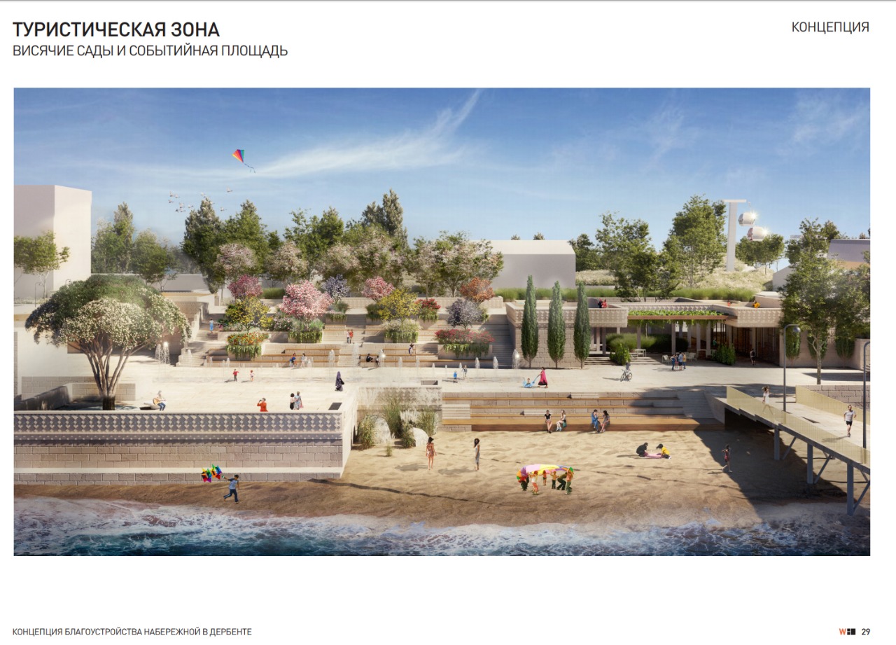 Проект разработан архитекторами московского бюро Wowhaus. Согласно концепции благоустройства, на набережной Дербента должны появиться современные зоны отдыха. Проект предусматривает устройства пирсов для причаливания судов, что вдвойне привлекательно с учетом того, что набережная города связана с нижней станцией канатной дороги. Это позволит причалившим к данной набережной подняться по канатной дороге на крепость «Нарын - кала».