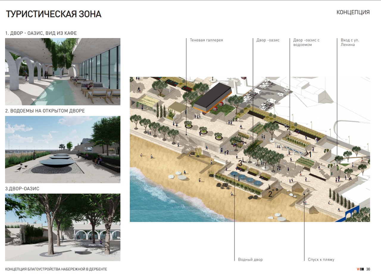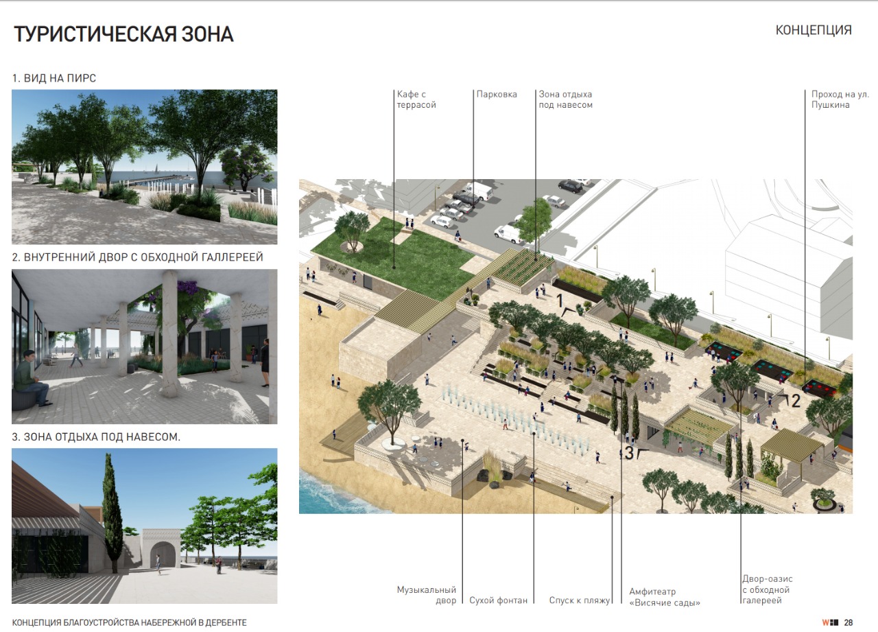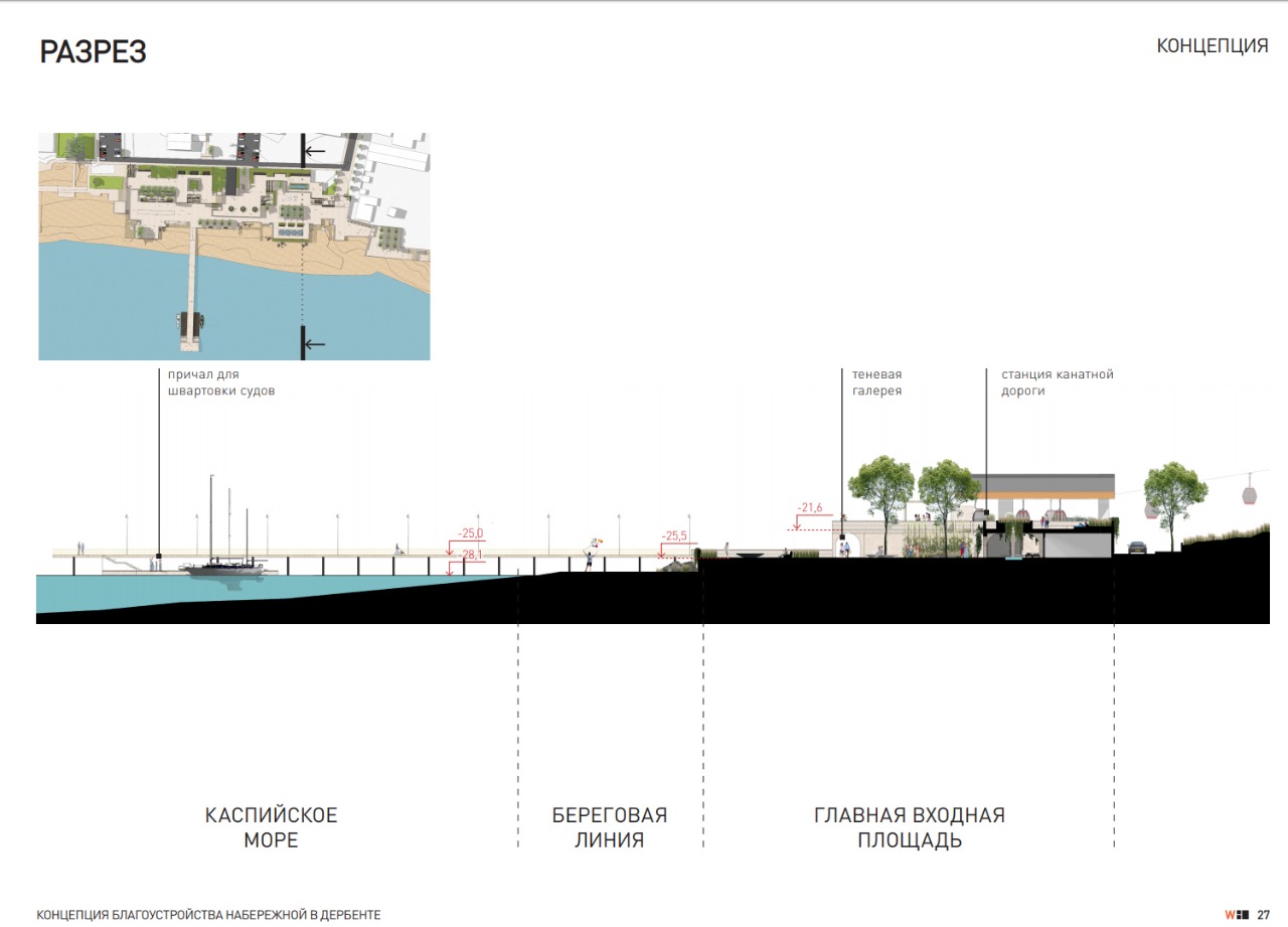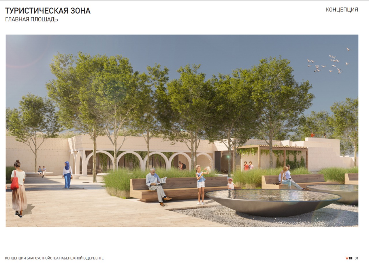 Проект разработан архитекторами московского бюро Wowhaus. Согласно концепции благоустройства, на набережной Дербента должны появиться современные зоны отдыха. Проект предусматривает устройства пирсов для причаливания судов, что вдвойне привлекательно с учетом того, что набережная города связана с нижней станцией канатной дороги. Это позволит причалившим к данной набережной подняться по канатной дороге на крепость «Нарын - кала».