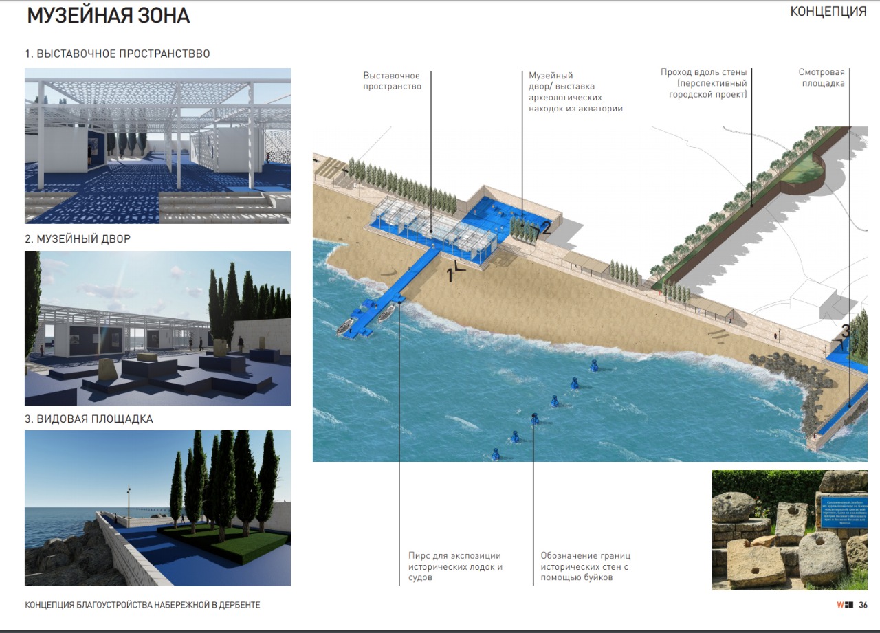 Проект включает в себя несколько зон с различной активностью – музейная, рекреационная, досуговая и прочие.