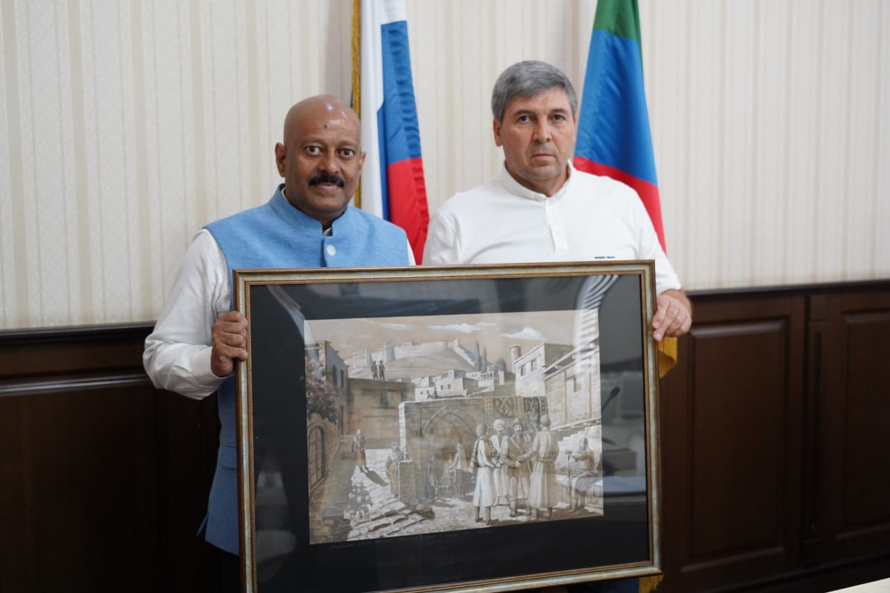 В завершение встречи  Ахмед Кулиев вручил консулу Ратиш Наиру картину с изображением приезда путешественника Афанасия Никитина в Дербент.