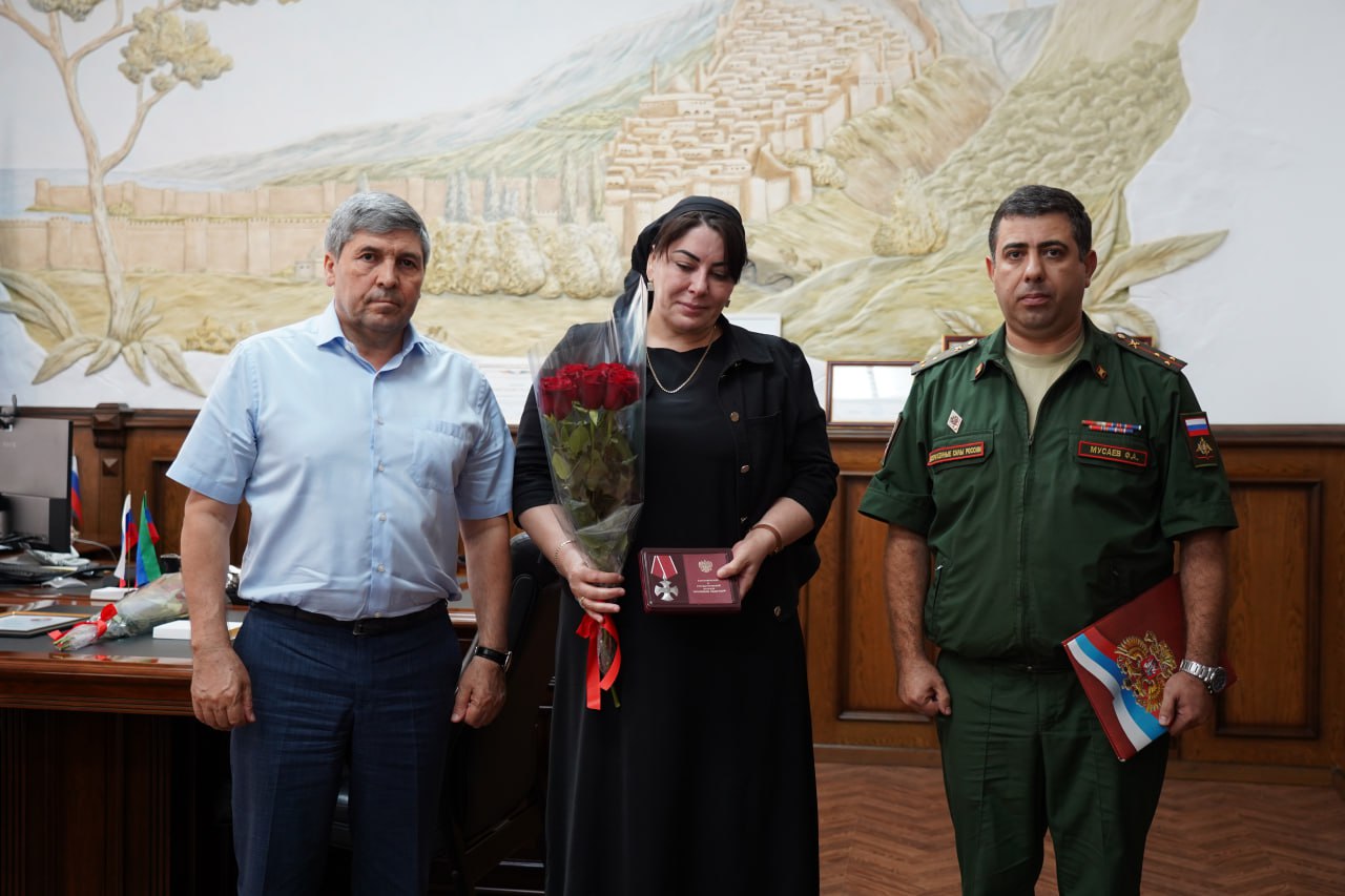 Сегодня, 20 сентября, глава Дербента Ахмед Кулиев за мужество, отвагу и самоотверженность, проявленные при исполнении воинского долга, вручил Орден мужества супруге Шахина Тагиева, погибшего в ходе специальной военной операции.