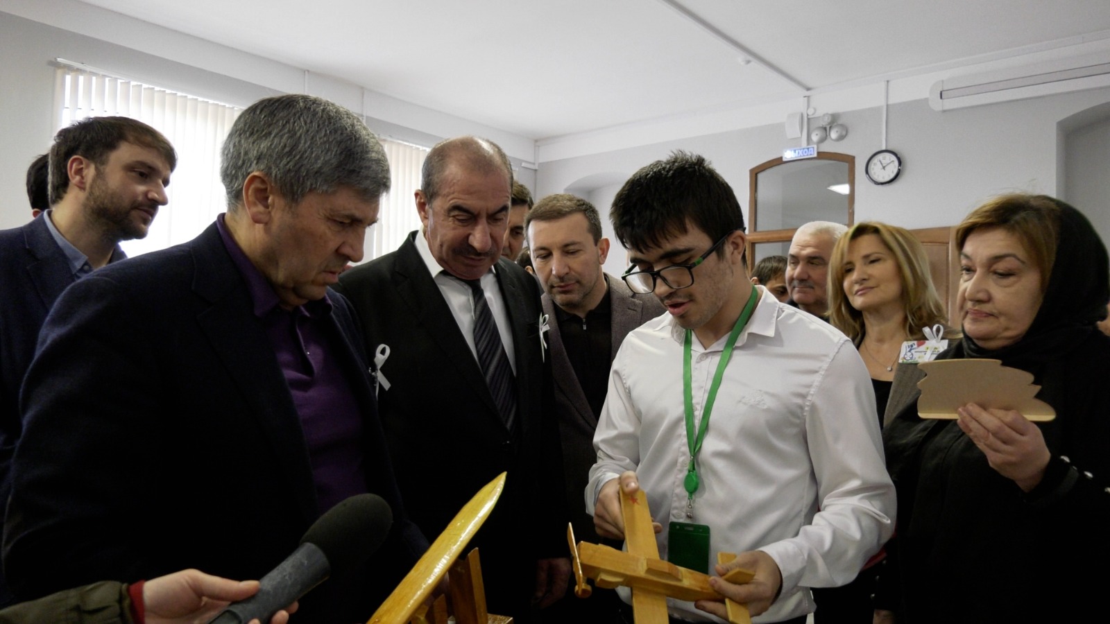 Ученик школы-интернат №7 Амир Шахсинов показал главе города игрушки из дерева, которые он сделал своими руками.