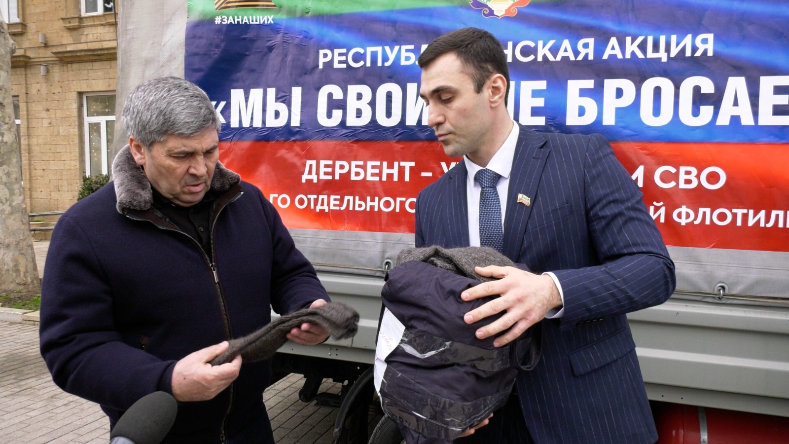 Сбор гуманитарной помощи осуществлялся силами волонтеров, школьников, общественных организаций и неравнодушных жителей города. В числе собранных вещей — тёплые носки, связанные активной волонтеркой, пенсионеркой из Дербента.