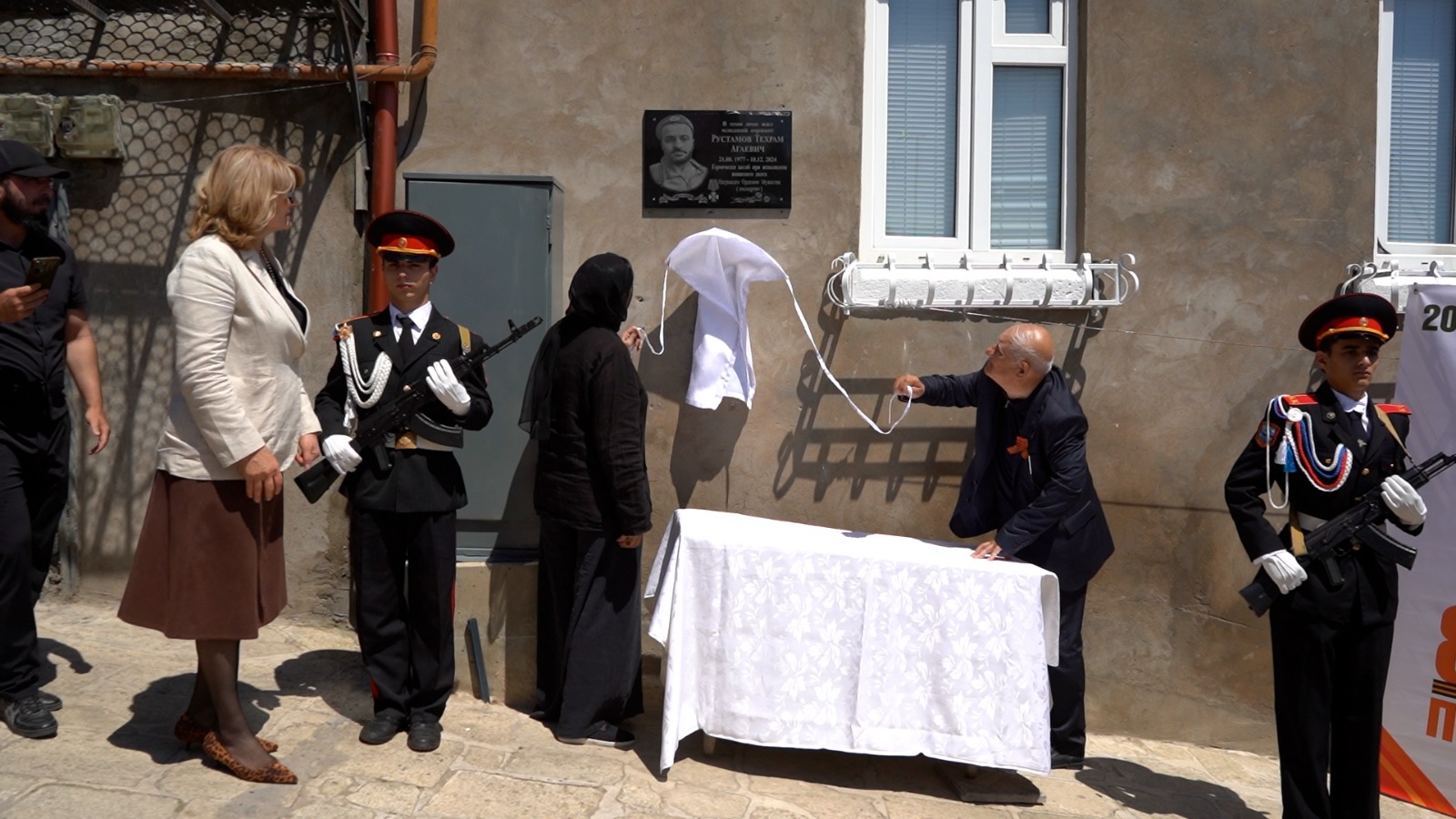 Почётное право открыть мемориальную плиту было предоставлено родной сестре Рустама Агаевича – Шарифе Сулеймановой и Гаджимураду Гаджимурадову.