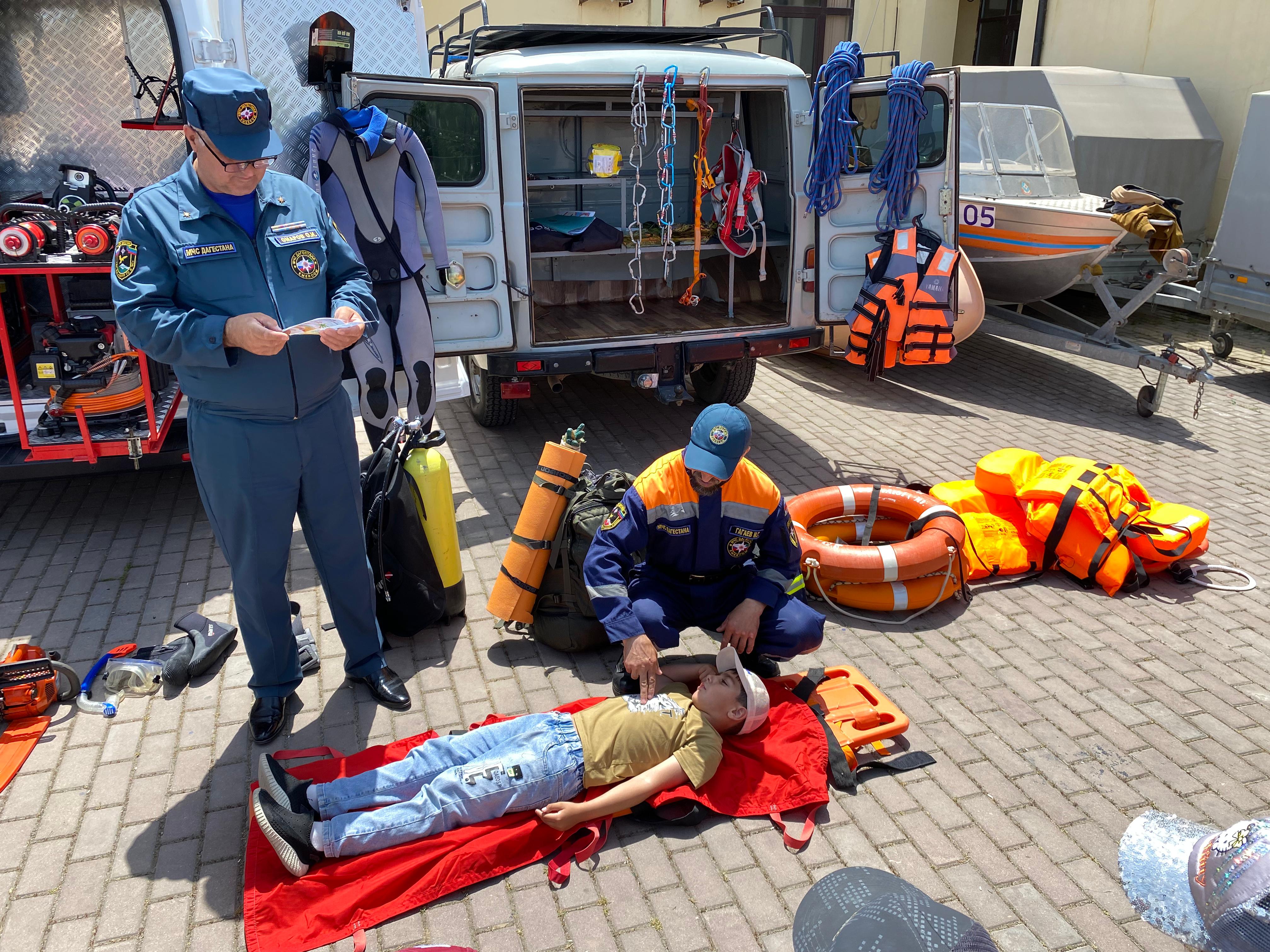 Заместитель начальника Дербентского поисково-спасательного подразделения Омар Омаров, спасатель 1 класса Максуд Гагаев и спасатель 2 класса Заур Рабаданов познакомили ребят с деятельностью подразделения, показали технику и снаряжения, рассказали об условиях их применения. Детям был продемонстрирован гидравлический аварийно-спасательный инструмент, показана работа других образцов аварийно-спасательной техники и оборудования. Им напомнили о правилах безопасности дома, в лесу, у воды, на улице, на транспорте, а также о способах оказания первой помощи и номерах телефонов экстренных служб.