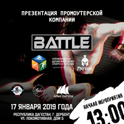 17 января 2019 года в конференц-зале комплекса "Алые Паруса" г.Дербент состоится презентация промоутерской компании "BATTLE" - селекционный, профессиональный турнир по ММА с отбором в одну из ведущих лиг России " БИТВА НА ВОЛГЕ "
